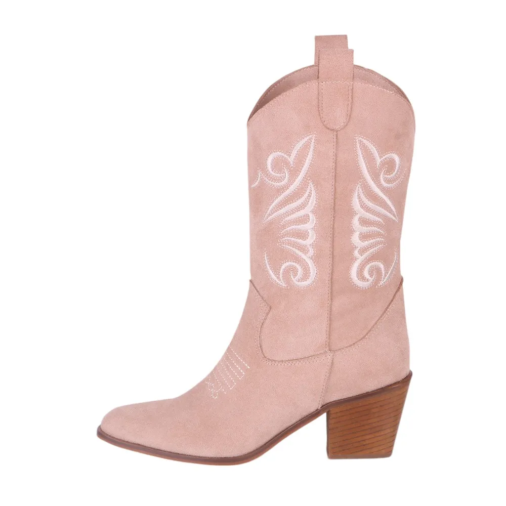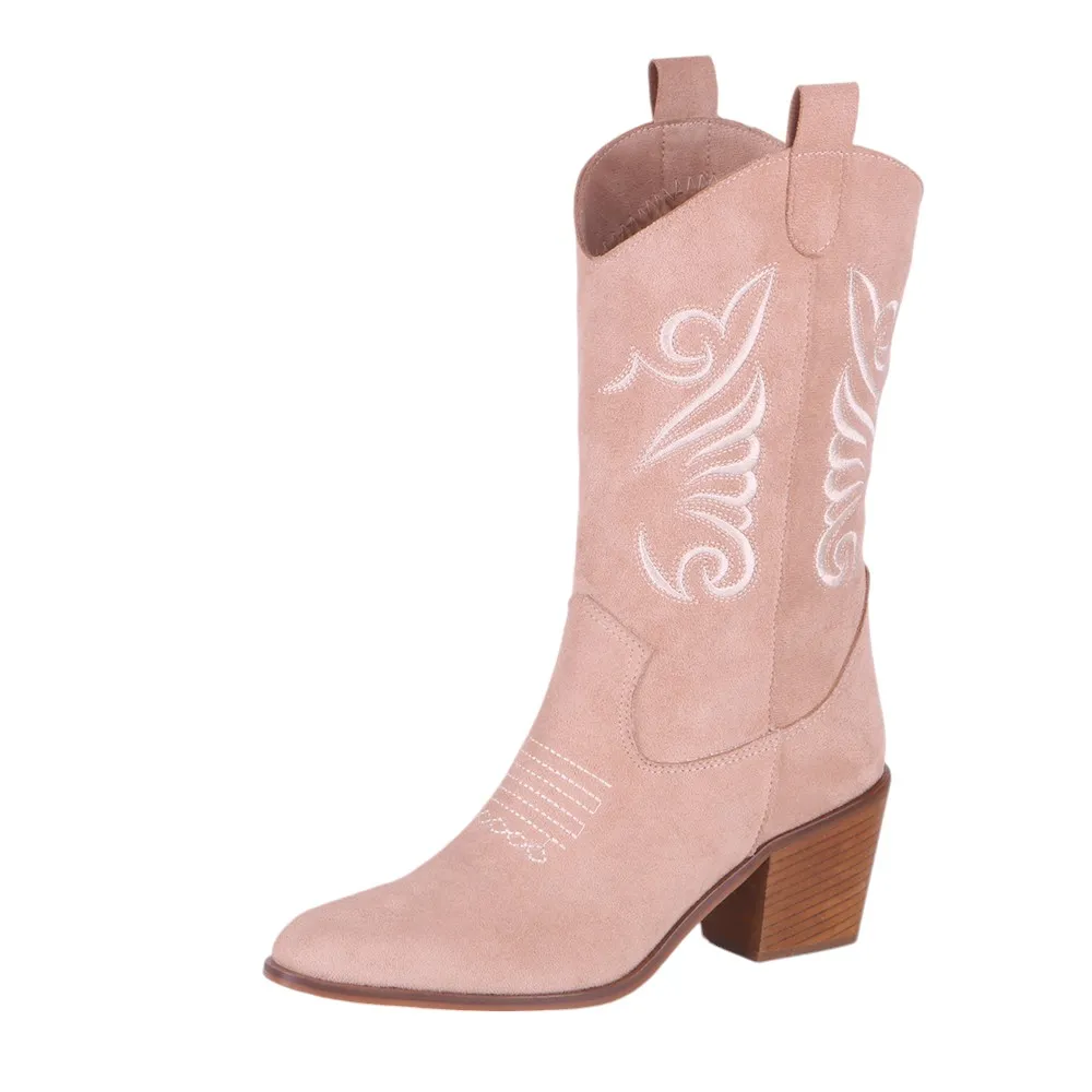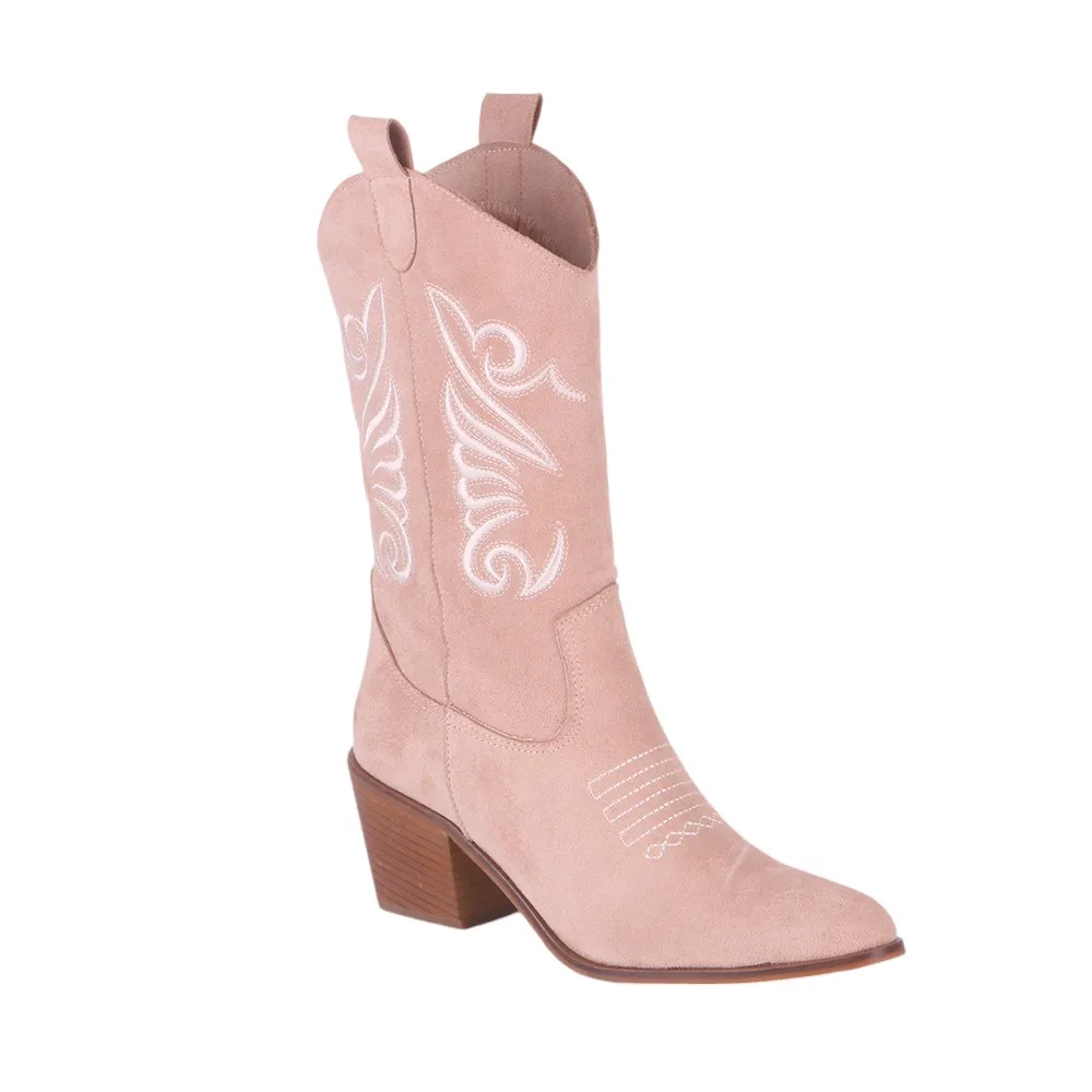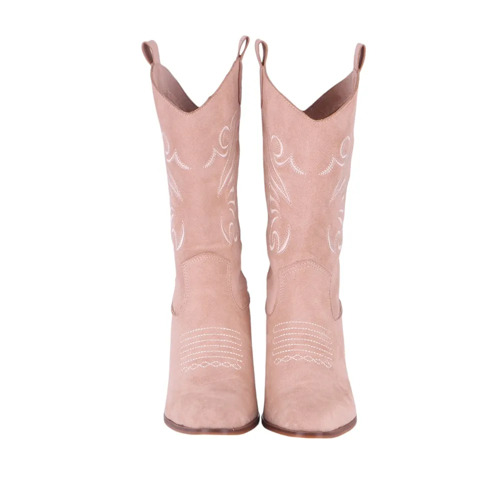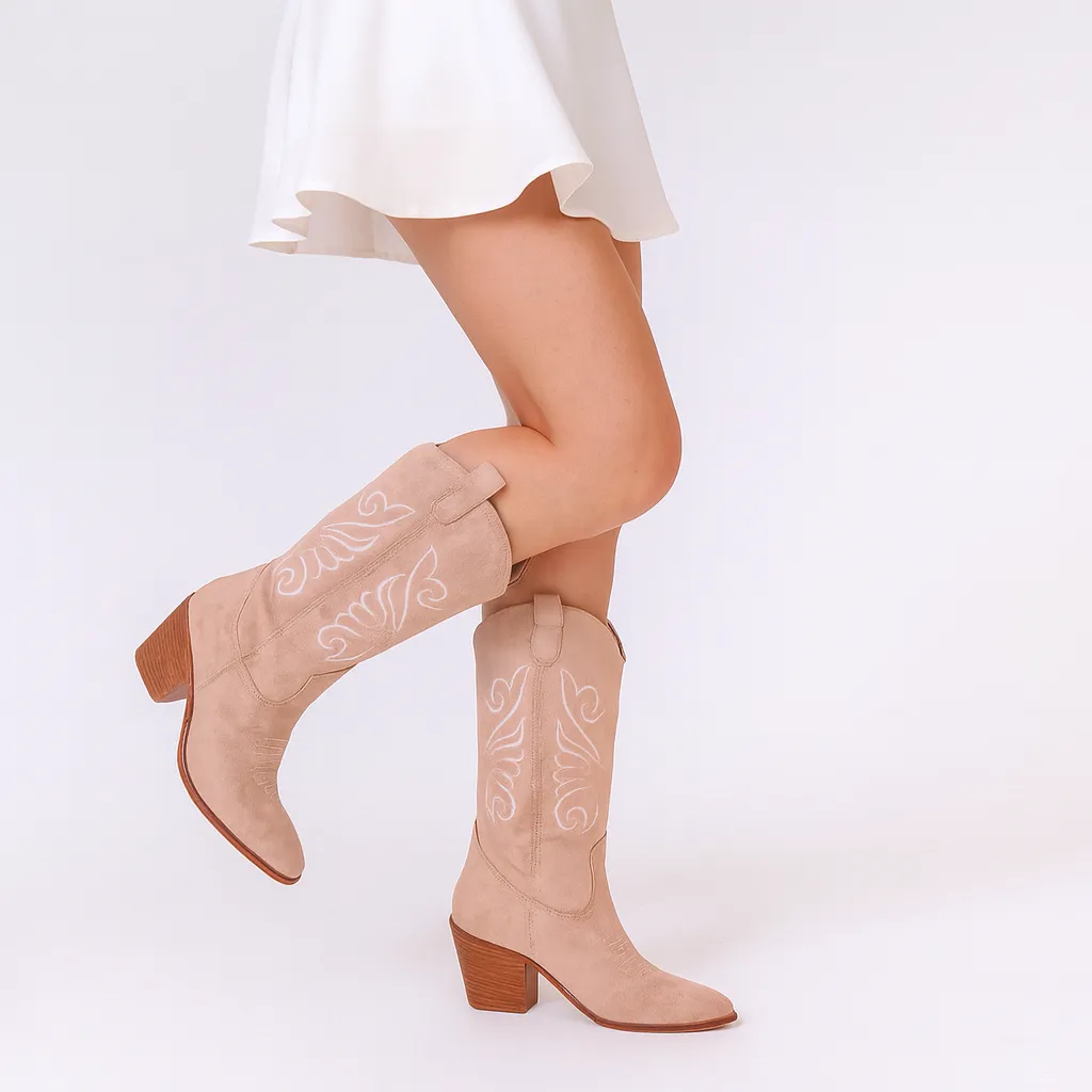 Beige Embroidered Western Boots for Women