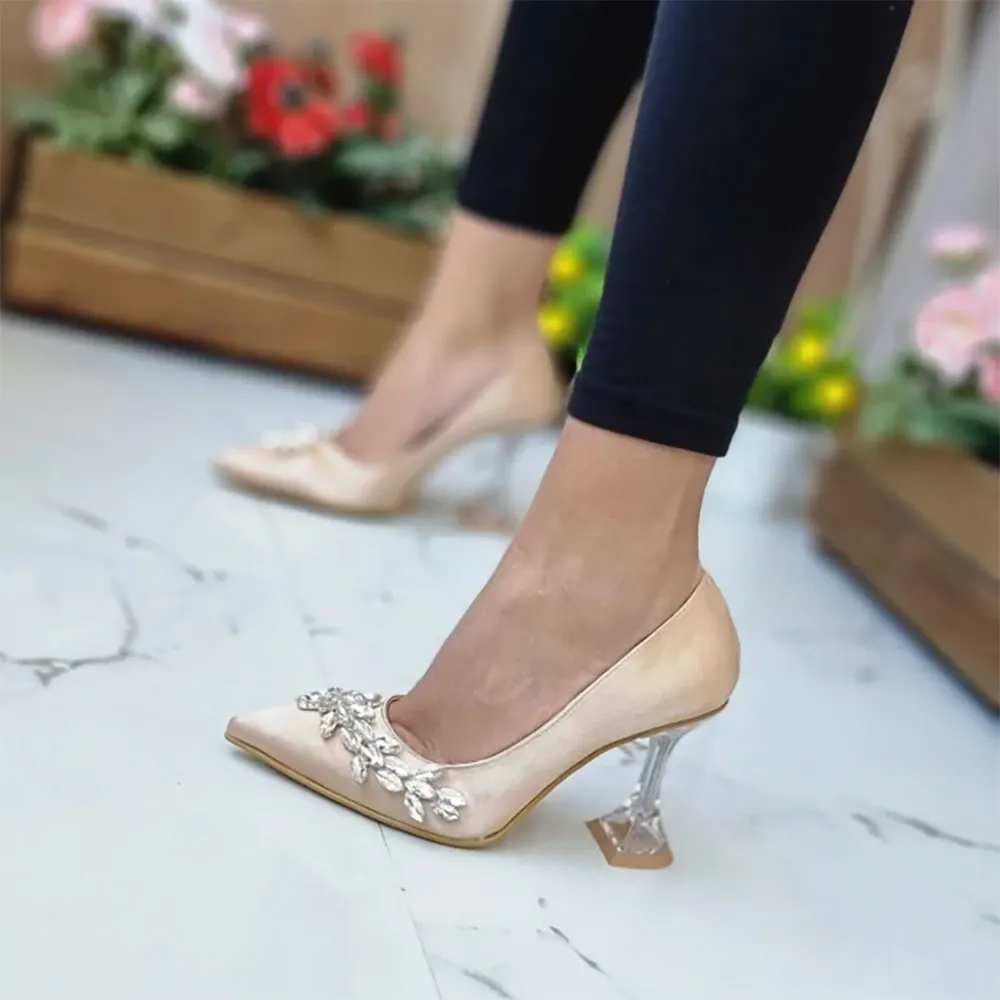 Beige Satin Rhinestone Stiletto Heels for Women RA-510