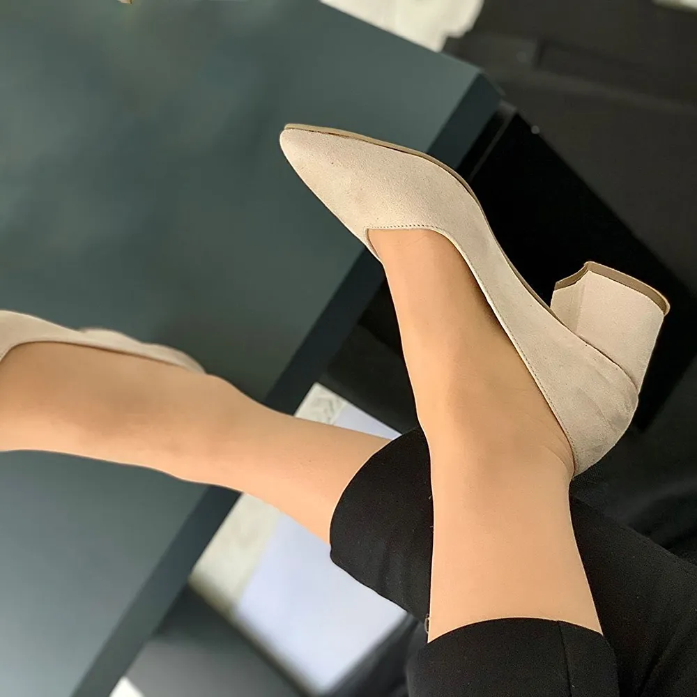 Beige Suede Block Heel Pumps for Women – Comfortable Closed-Toe Mid Heels