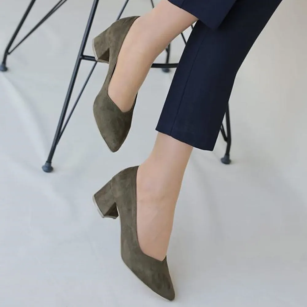 Green Suede Block Heel Pumps for Women – Comfortable Closed-Toe Mid Heels